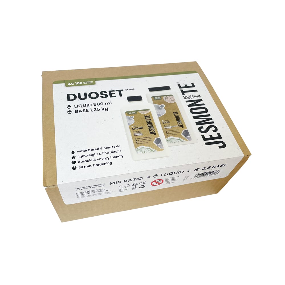 Jesmonite AC100 DUOSET komplekts – ērts risinājums ar visu nepieciešamo mazākiem projektiem vai radošiem izmēģinājumiem. Komplektā ietilpst 500 g Jesmonite AC100 šķidruma un 1250 g Jesmonite AC100 bāzes, jau sagatavoti ieteicamajā 2,5:1 svara proporcijā. Šis duets ir ideāli piemērots gan iesācējiem, gan pieredzējušiem radošiem meistariem, kuri vēlas izpētīt Jesmonite iespējas.