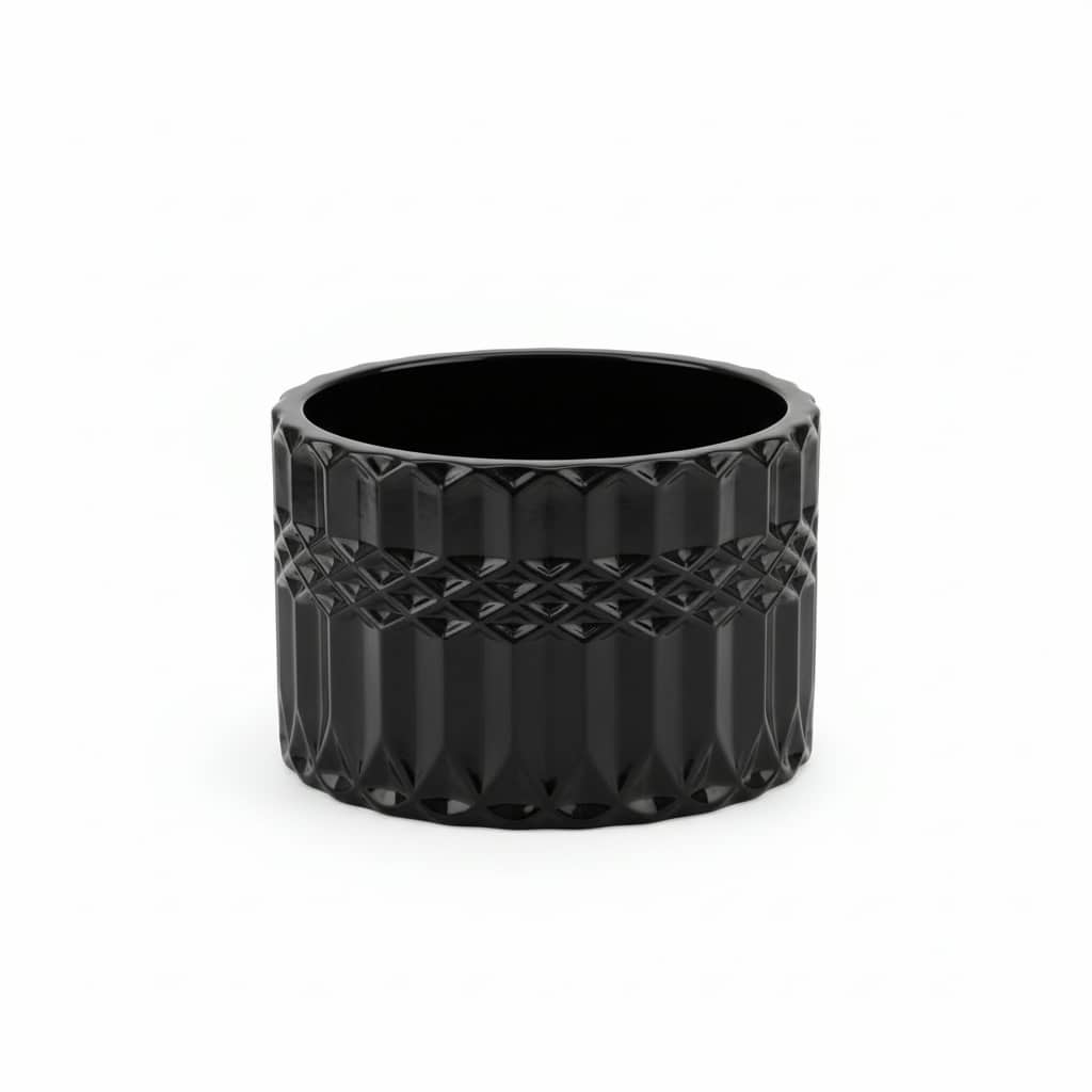 Izteiksmīgais “cut glass” gravējums smalki spēlējas ar gaismu, savukārt dziļais melnais tonis lieliski izceļ etiķetes, logotipus un metāliskus akcentus. Komplektā iekļautais vāciņš nodrošina gan praktiskumu, gan estētiku — lieliska izvēle dāvanām un profesionālām sveču līnijām.